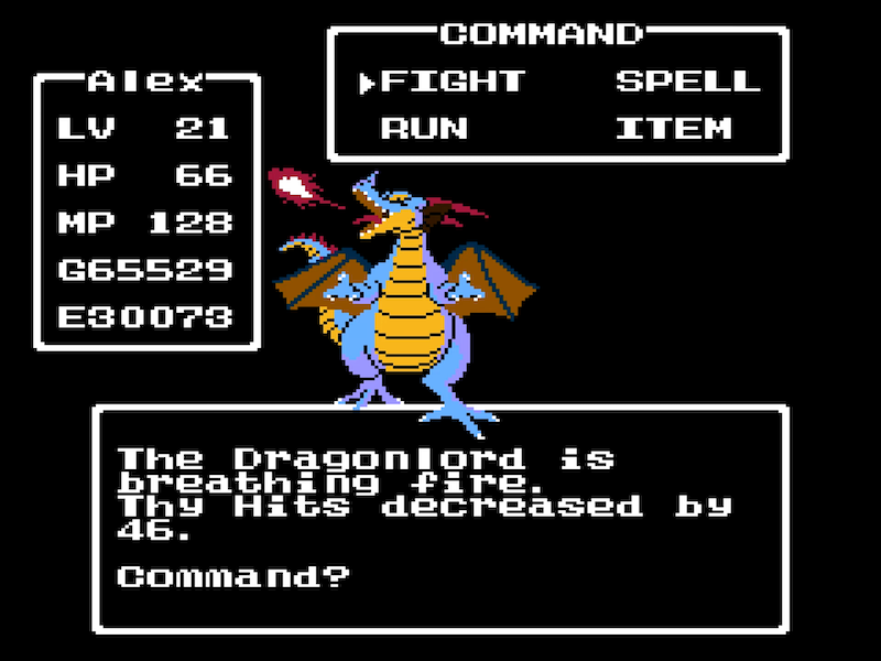 Dragon Quest, titled Dragon Warrior when initially localized to North America, is a 1986 role-playing video game developed by Chunsoft and published by Enix for the Nintendo Entertainment System. It was originally released in Japan in May 1986 and by Nintendo in North America in August 1989. It is the first game in the Dragon Quest video game series. Dragon Quest has been ported and remade for several video game platforms, including the MSX, MSX2, PC-9801, Super Famicom, Game Boy Color, mobile phones, and Nintendo Switch as of 2019. The player controls the hero character who is charged with saving the Kingdom of Alefgard and rescuing its princess from the evil Dragonlord. Dragon Warrior’s story became the second part in a trilogy, with several spinoff anime and manga series. — Wikipedia