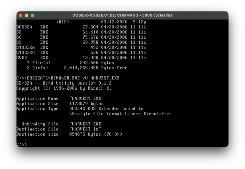 To be able to make any meaningful progress, we need Ghidra to be able to analyze teh un-exetended EXE. After looking around I found a blog describing how to “Disassemble DOS/4GW” which hinted at being able to use the SUNSYS Bind Utility to extract a Linear Executable from the extended EXE.