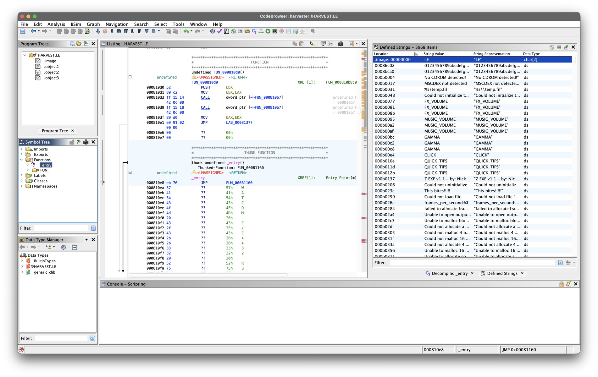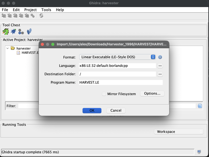 When running this against HARVEST.EXE it will produce a HARVEST.LE, which is the linear executable. Once we have this the next logical step would be to try and load it in Ghidra, but doing this doesn’t quite work as Ghidra thinks the LE file is raw data.