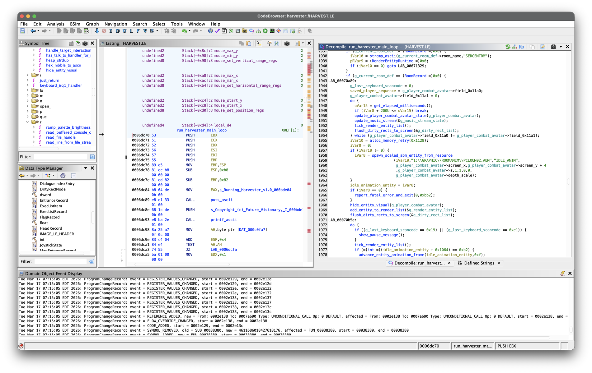 After doing this and restarting Ghidra, the LE EXE format should be properly detected, and we can load this and begin our analysis. Since the goal is to develop a working ScummVM game engine, we’ll be working on a harvester branch of a ScummVM fork.