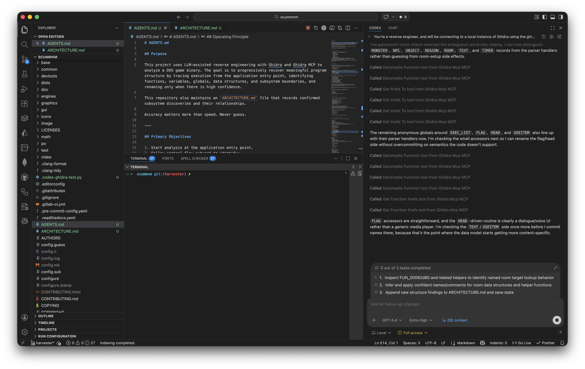 The AGENTS.md file outlines operating parameters such as keeping track of our findings in an ARCHITECTURE.md file and ongoing progress in a TRACKER.md file. As we progress with subsequent prompts, more of the linear executable in Ghidra will be decompiled, making it easier to work with as a source of truth for our re-implementation efforts.