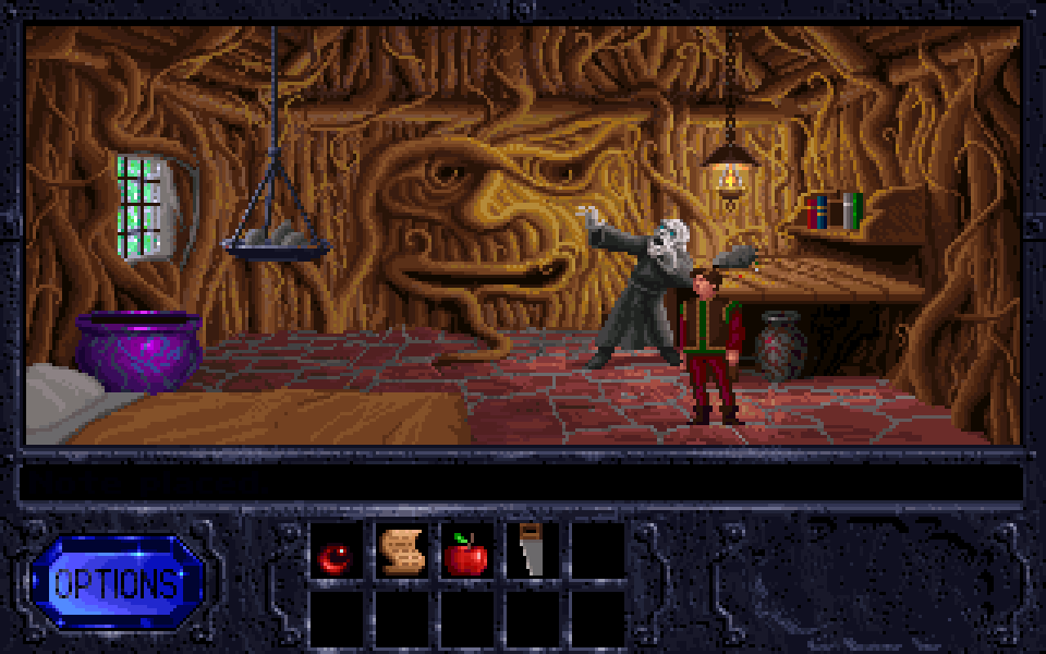 Your main goal in this game is to amass magical power so that you can fight Malcolm and free Kallak from the stone spell that was cast on him. This is done by getting an amulet that displays in the lower-right portion of the screen as 4 stones. Each time you learn a spell one of these stones lights up, and if you click it you’ll cast that spell.