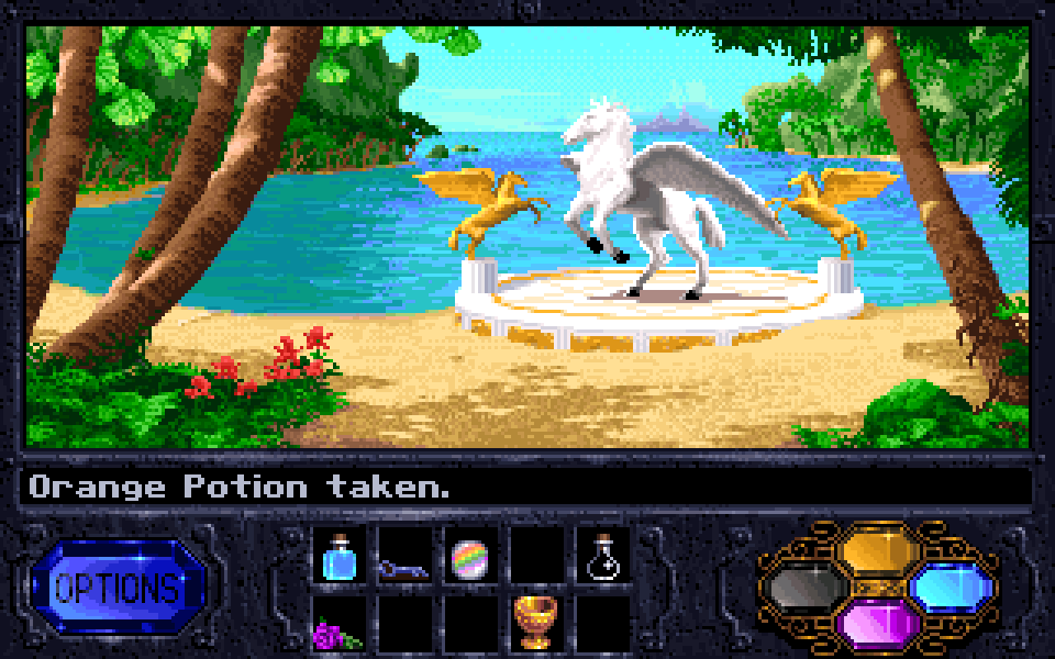 Though you’re trying to get magic spells, the second half of the game also involves mixing potions that act as single-use spells. This was just another excuse to pad the game out with backtracking fetch-quests, as mixing the potions wrong involved depleting consumable items you’d then need to go back and re-fetch to try again in a different combination.