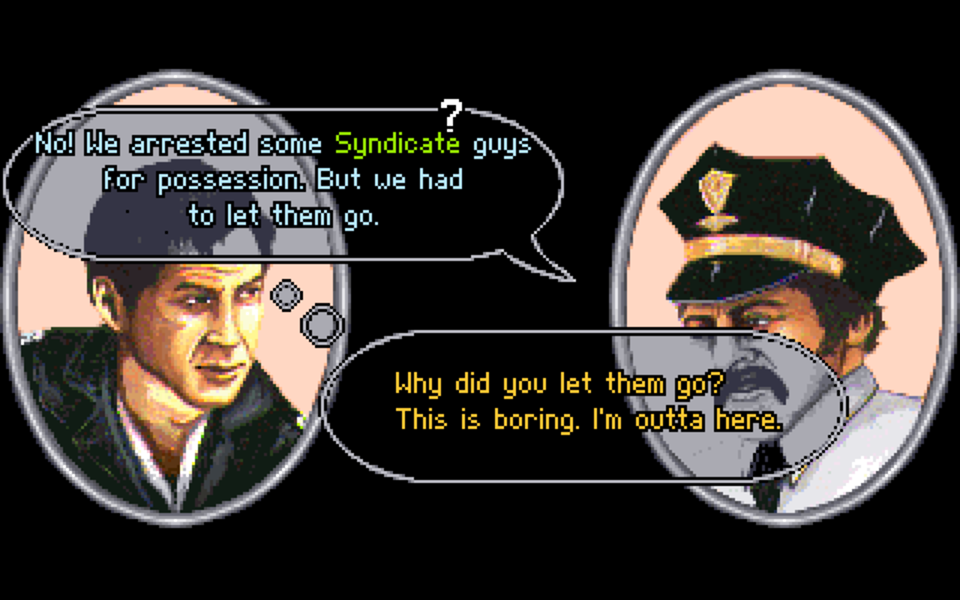 The jailbreak sequence involves navigating a maze. I HATE MAZES. This was just unnecessarily drawn out because there’s nothing to do but grind your way through using trial and error until you muddle your way to the end. I’m sure there are people that genuinely enjoy mazes, but I’m not one of those people so I call them out whenever I encounter them (as I did with Manhunter 2: San Francisco, Return to Ringworld and The Legend of Kyrandia: Fables and Fiends).