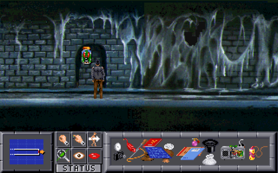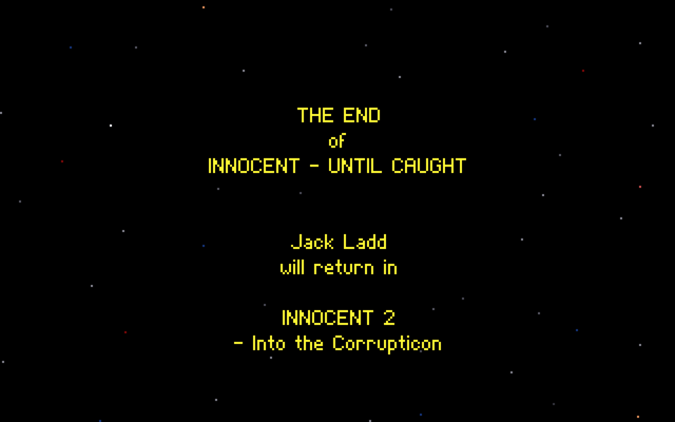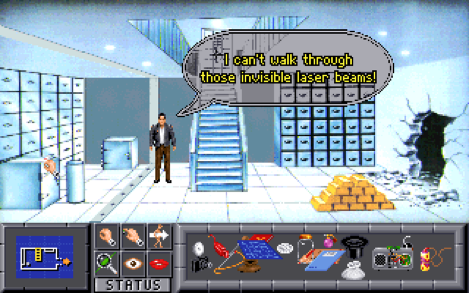 Innocent Until Caught is pretty standard in terms of design but introduces some innovations when it comes to the interface. It features a mini-window at the bottom left of the screen which is alternately a mini-map of the area (showing all exits) and a looking glass for detecting small items. The inventory is a box-window in which objects can be placed wherever player wants (even on top of others). Also, the plot is illustrated by a few rendered sequences, some of the first used in adventure games.1