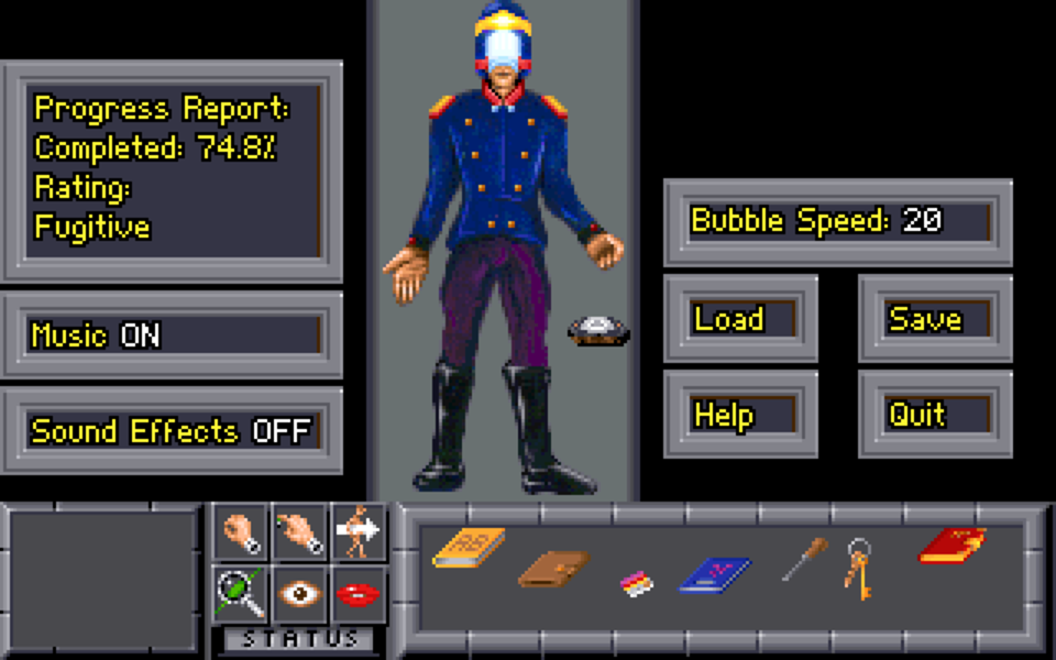 Your status screen also shows a profile of Jack T. Ladd which serves absolutely no purpose until the very end of the game, at which point you can use this to change your clothes to impersonate a guard.