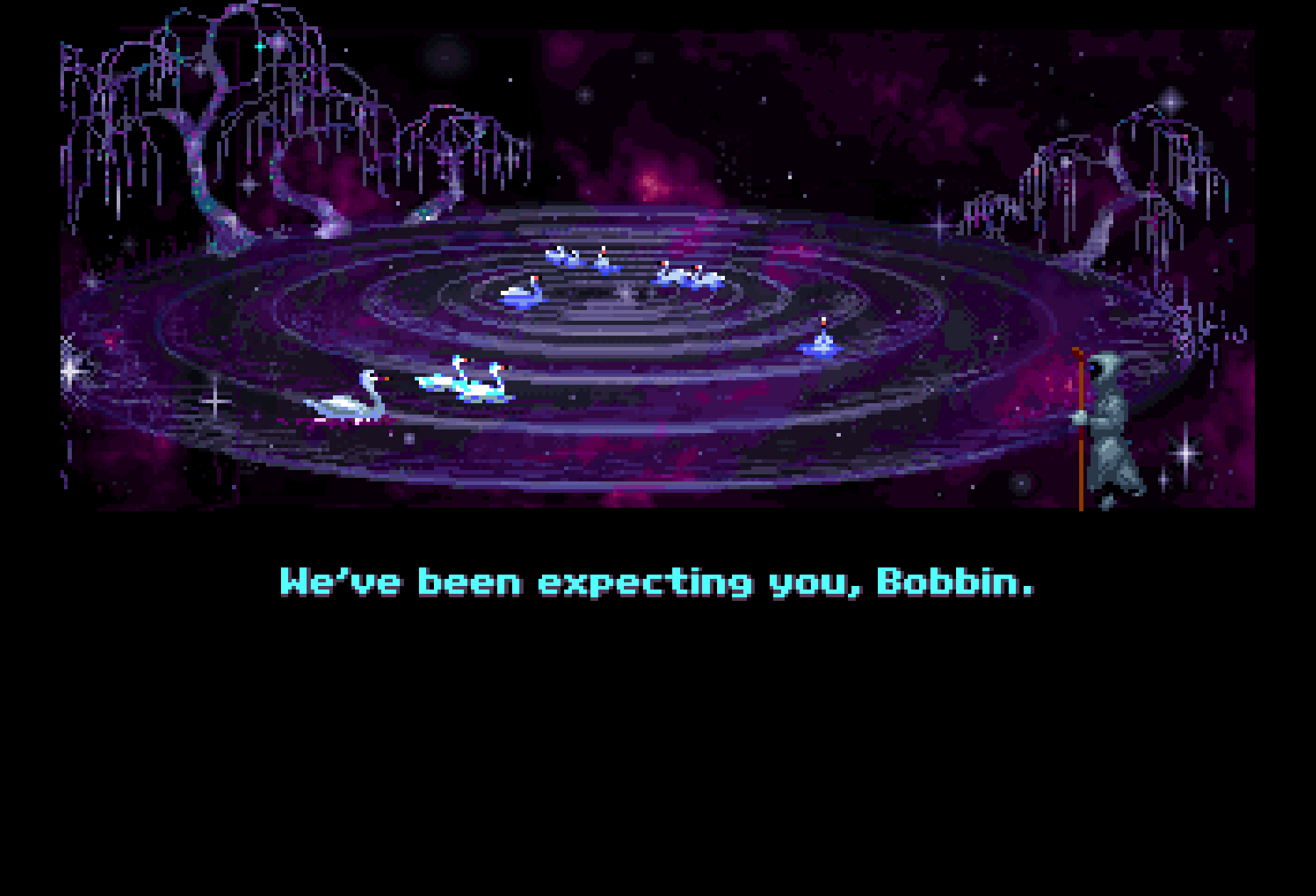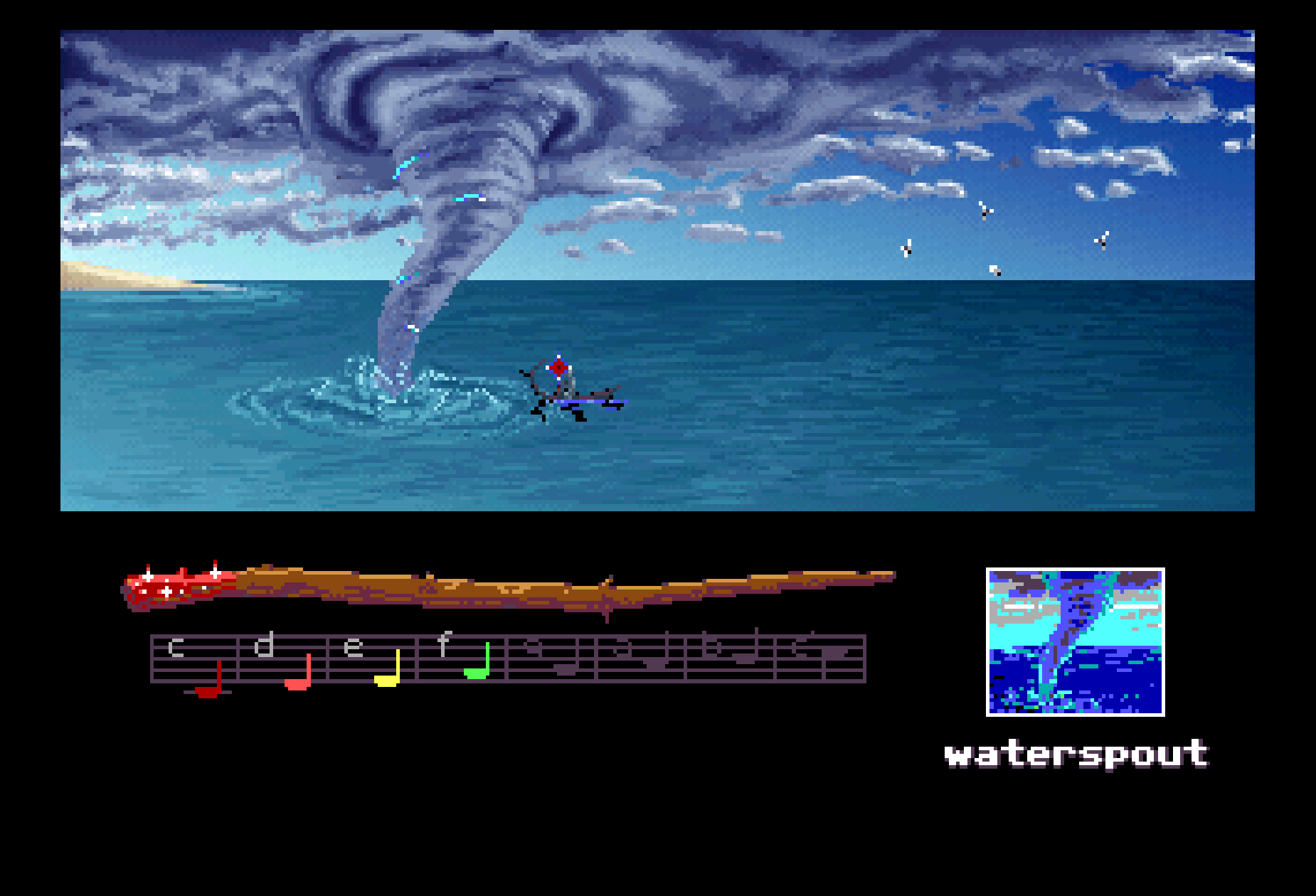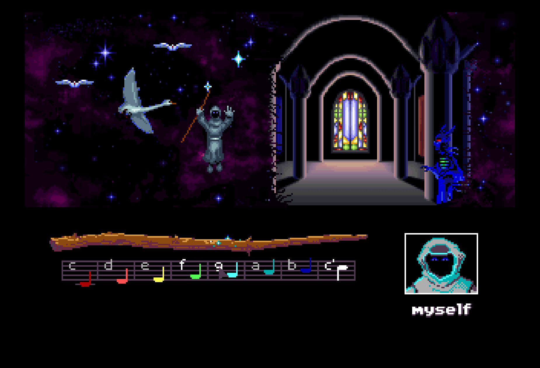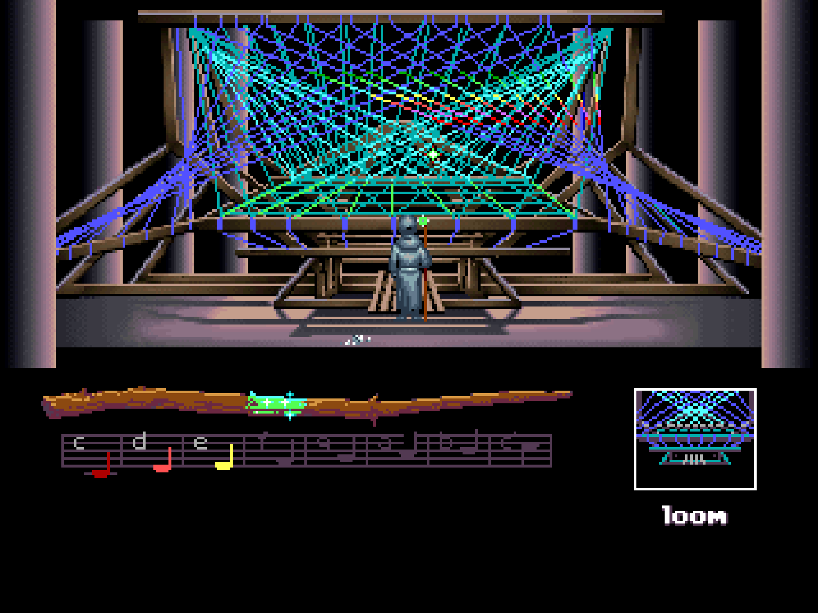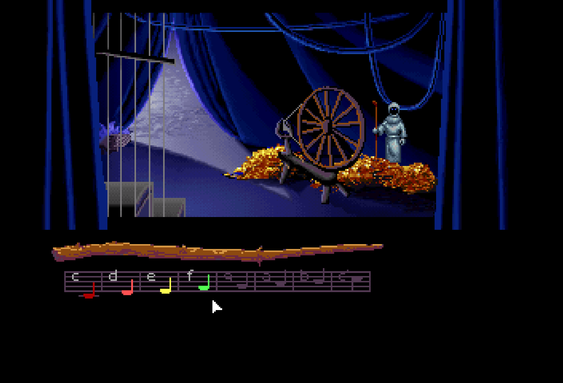 Loom is an adventure game that sets itself apart from other titles in the genre through its unique gameplay system: the player character does not carry items around, but rather manipulates objects through the use of spells (called “drafts” in the game). The drafts themselves are woven by playing magical notes on a special instrument called “distaff”. All the puzzles in the game are solved by learning and correctly applying these drafts.1
