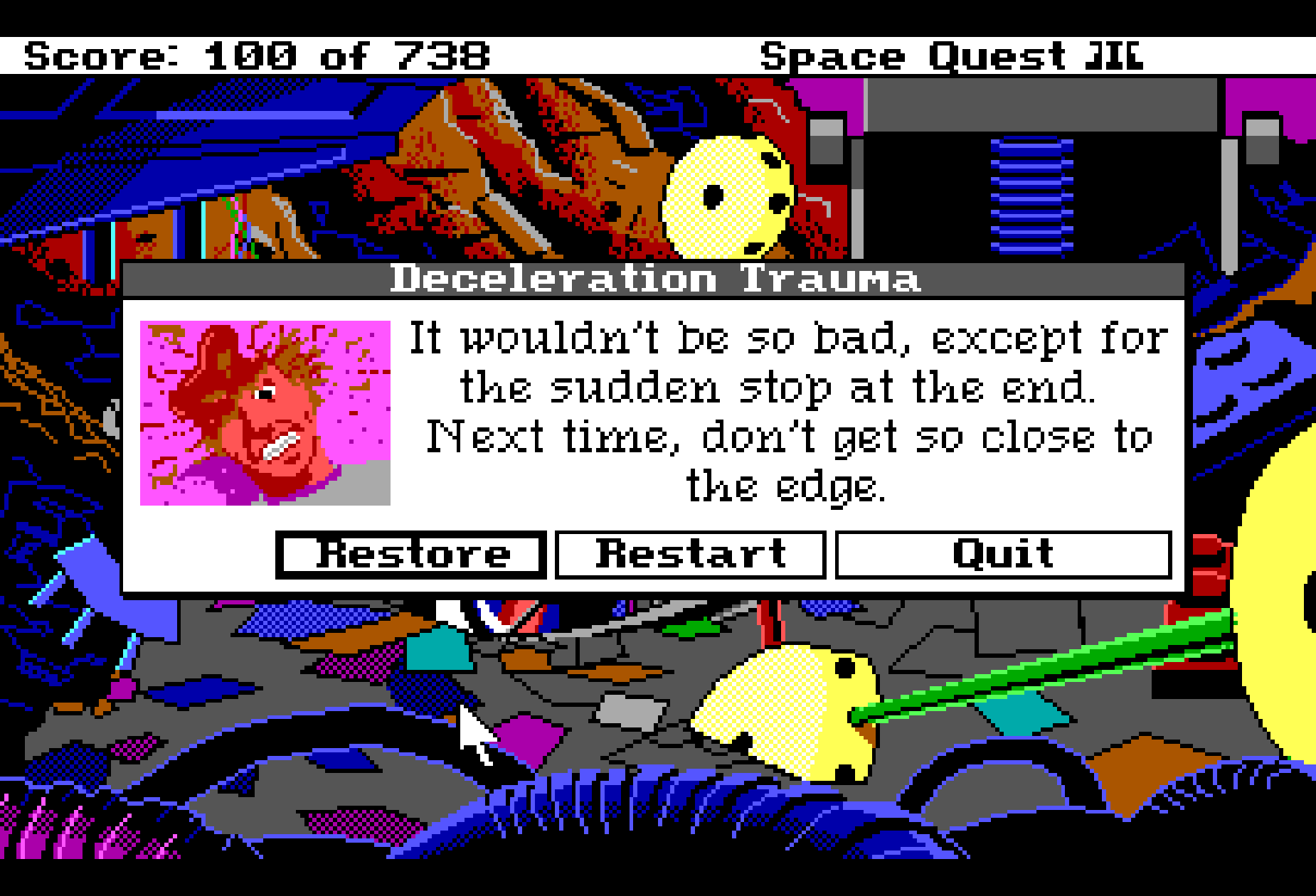 Space Quest III is very short, but the writing is funny and the pacing is good. You don’t really need a walkthrough because every time you die you’ll be presented with a popup that typically (a) makes fun of you for dying and (b) nudges you in the right direction to avoid dying again.