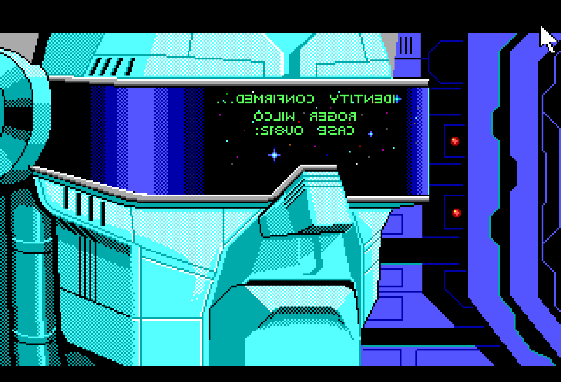 The first third of the game has you trying to escape from a Terminator-like cyborg that is out to collect on a dept Roger incurred in the previous game. After you find a ship in the initial stage and set a course for Phleebhut, the cyborg follows him there and attempts to hunt him down and capture him.