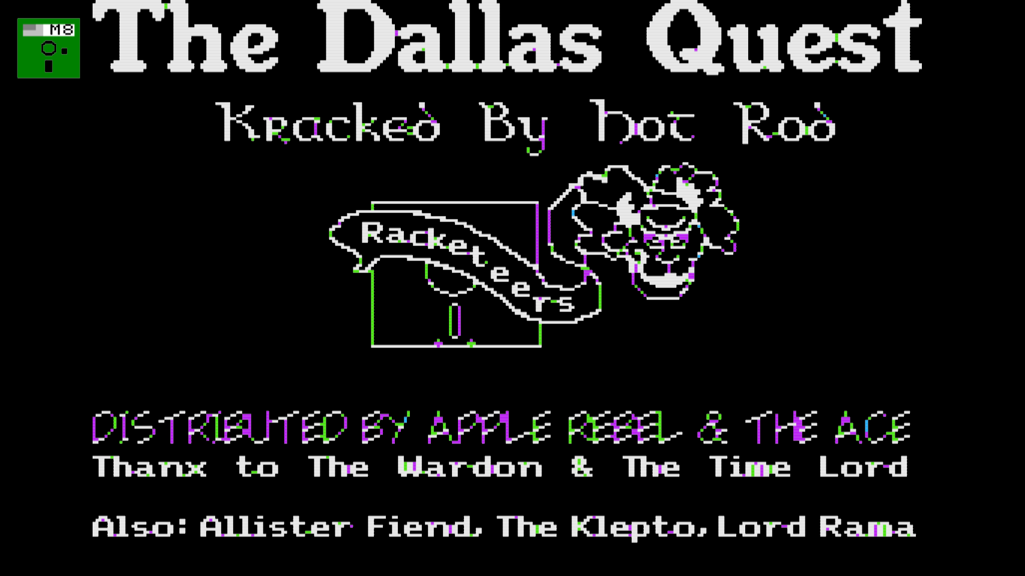 Switching over to the Apple II version of the game lets you once again experience the glory of the cracktro scene. Though not animated or interactive, I still appreciate the work that these programmers put into these digital taggings.