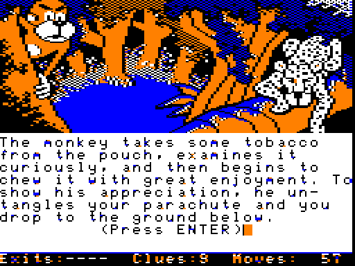 Your travels ultimately lead you to the jungles around Playa Peligro, in South America, where you overcome a series of obstacles by using various techniques, but mostly by doping a friendly monkey with tobacco – a firm reminder that we’re descending beneath even soap opera plot conflicts and sitting squarely in an early-‘80s text adventure game, with all of the internal logic-twisting that entails.1