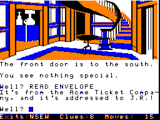 When a game is faithful to the poor writing and wildly implausible plot conventions of a soap opera, does that make it a bad game or an effective adaptation of its source material? In any case, this game situates you as a private investigator hired by Sue Ellen to find a map to hidden oil fields, in hopes to accumulate enough wealth to escape the sinister influence of J.R. Sue Ellen offers you a reward of $2 million for the map. You snoop around the grounds of the South Fork Ranch, superficially interacting with much-loved characters from the TV show and an assortment of extras from the animal kingdom. You must avoid J.R. who would like to put a stop to Sue Ellen’s plans. So far, so good.1
