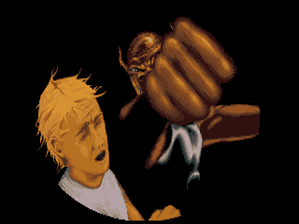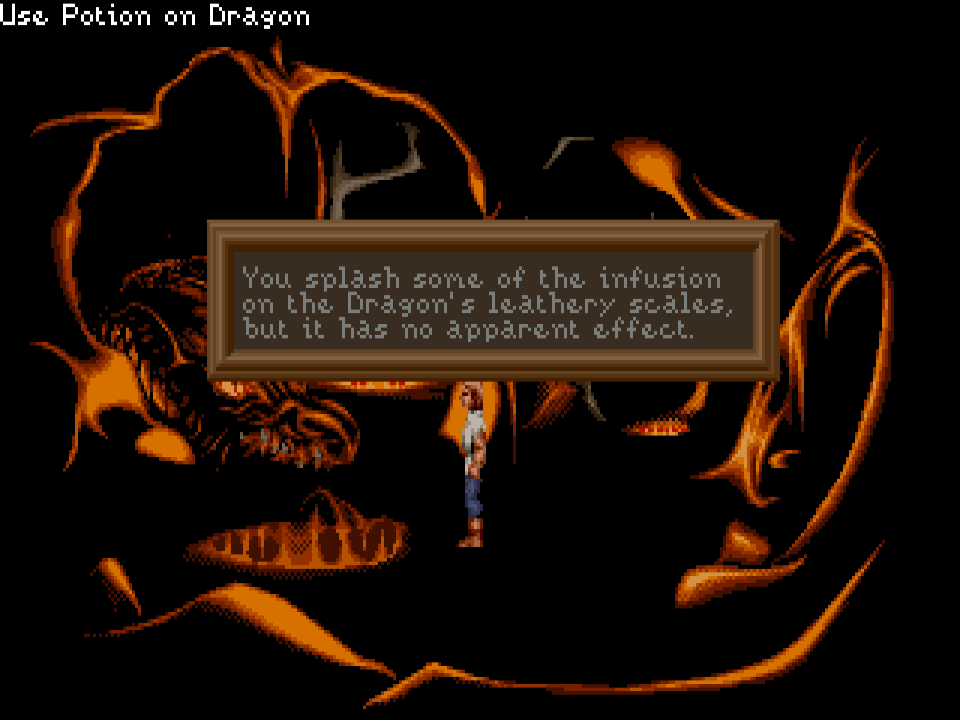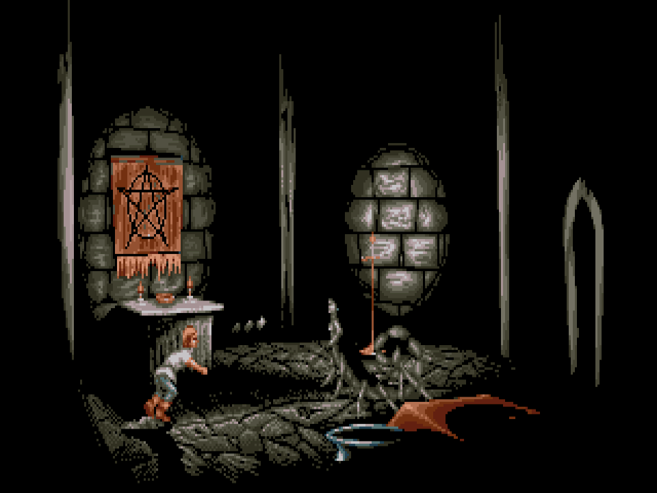 Crossing the drawbridge triggers the second combat sequence of the game with another boar looking thing. After defeating him you advance to Selena’s room, where she turns into a scorpion and you automatically throw the Eye of Gethryn at her and the game is done.