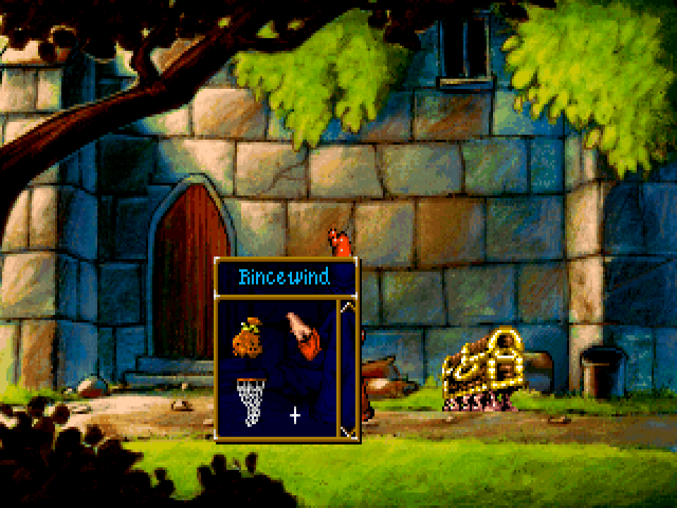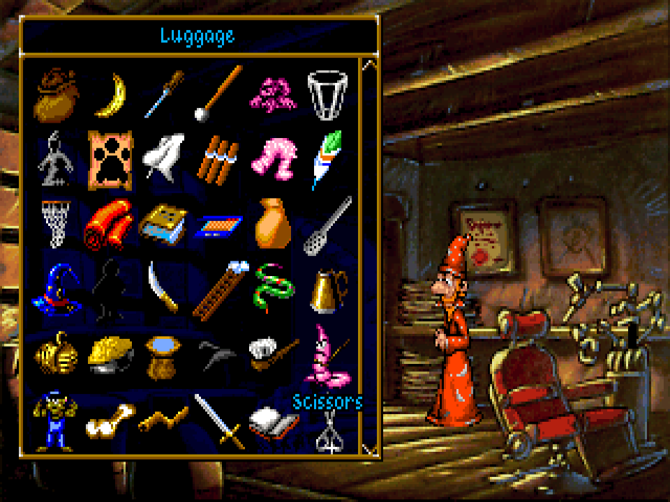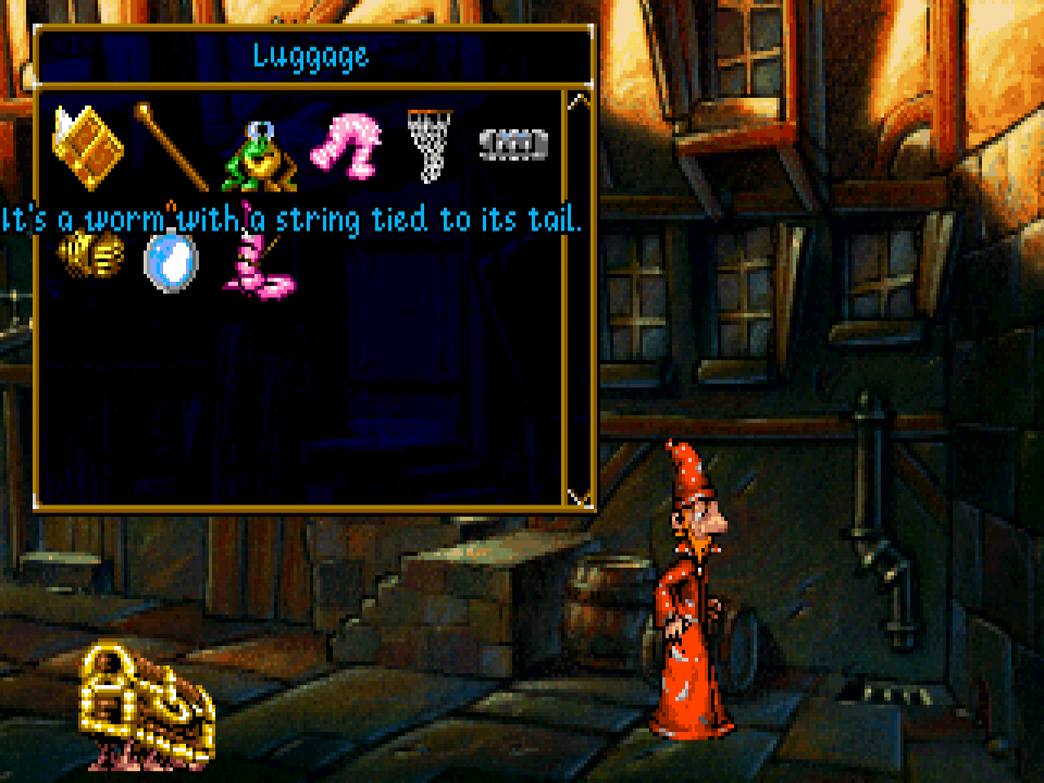 Inventory management plays a pretty large role in this game as there are several puzzles that require Rincewind to take items with him to a location the chest can’t access. Typically it’s not obvious what you need to bring with you and the will involve trial and error, backtracking and repetition.
