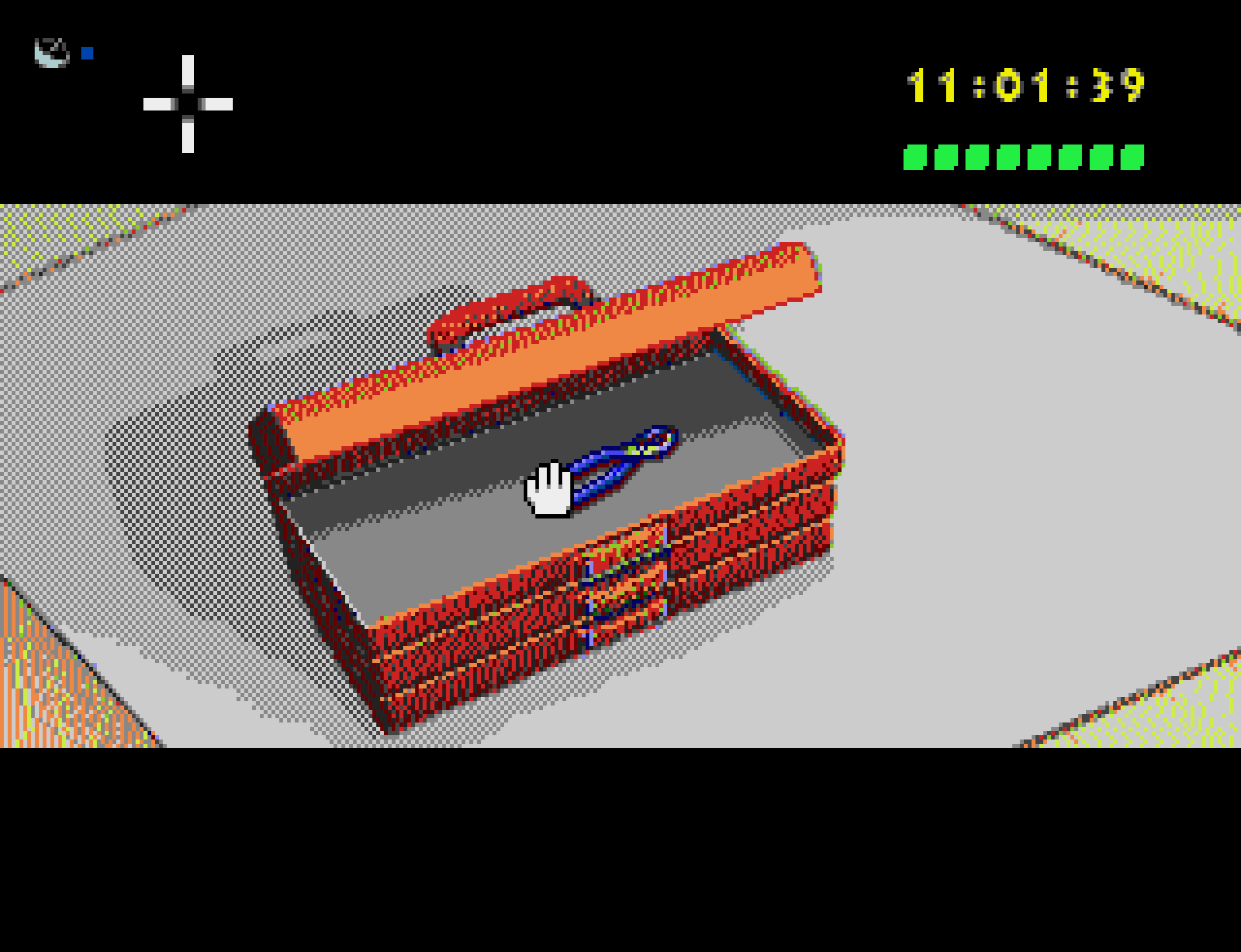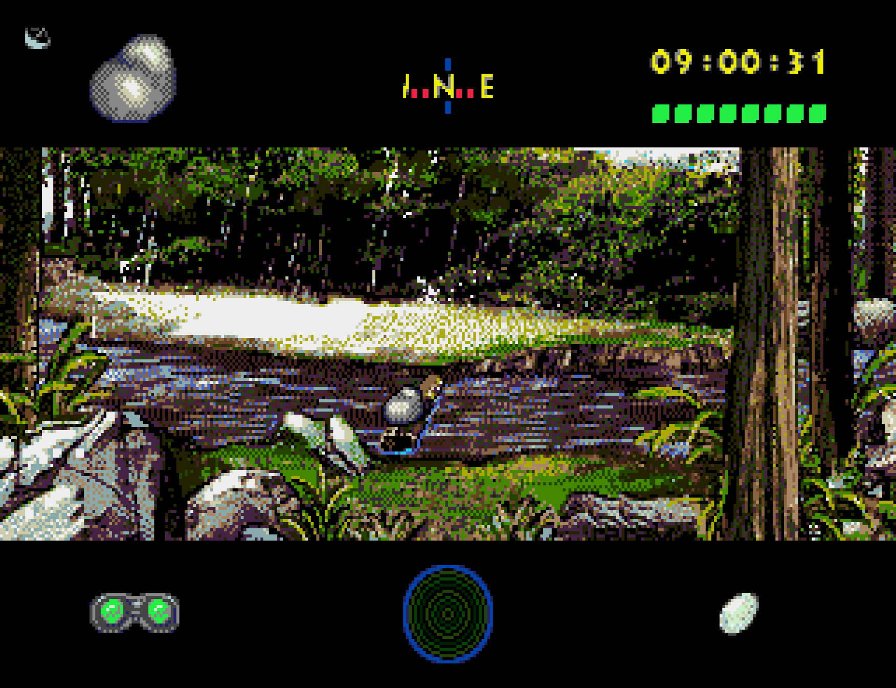 The game splits the view into 3 “strips”. The top strip shows the currently selected item/action, the direction you’re facing, how much time you have left and your health. I don’t really know what the satellite icon represented and couldn’t find anything in the manual about it either.