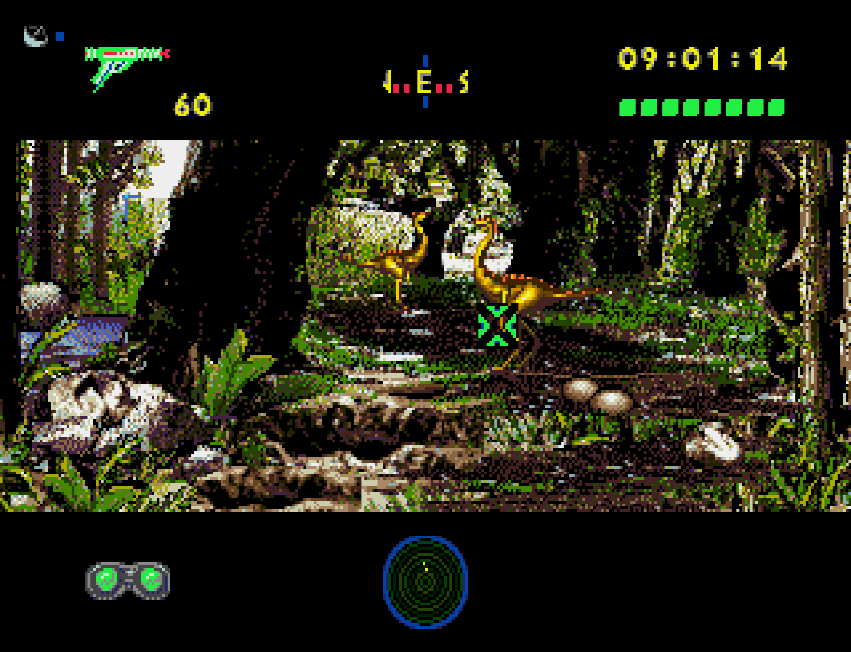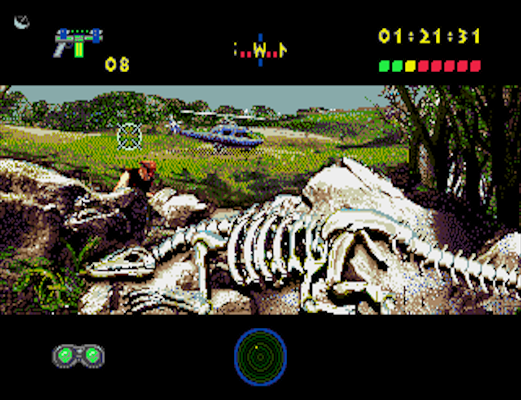 Jurassic Park incorporates an arcade shooter style mechanic as well. You can pick up various weapons throughout the game that you can use on the dinosaurs to get them out of your way, or distract/stun them.