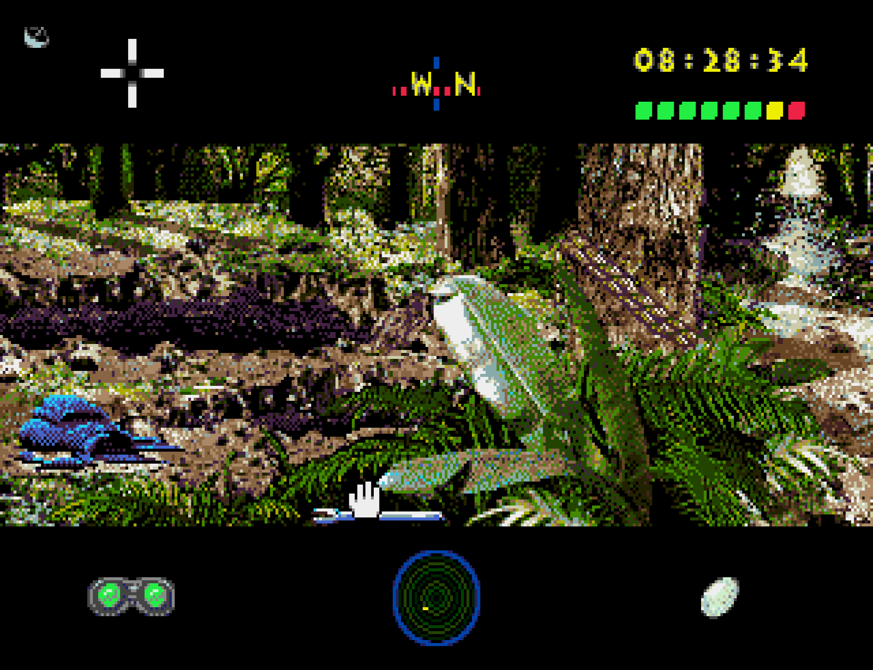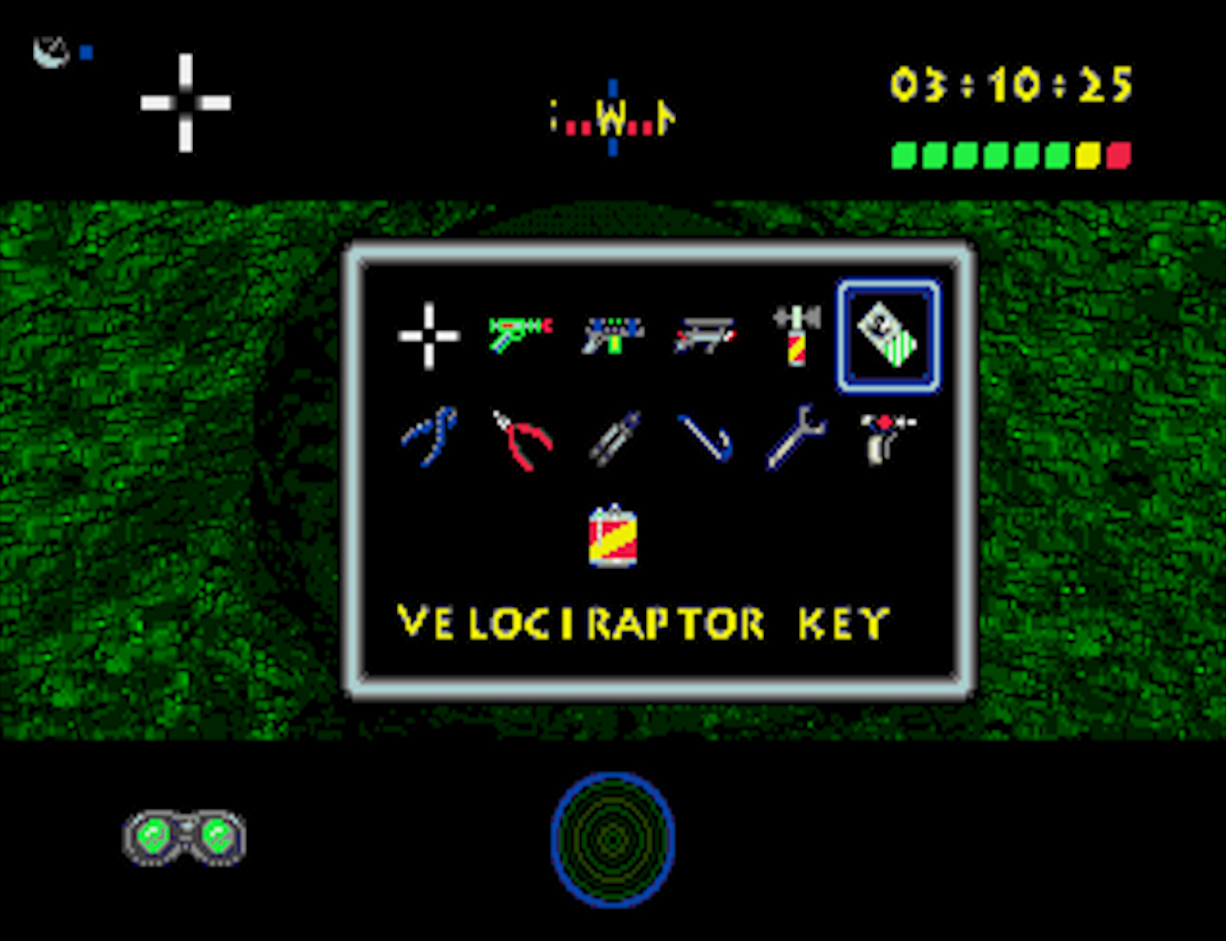 The bottom strip of the screen shows your permanent items, such as the night vision goggles or the motion detector. The latter is extremely useful when you’re navigating an area with dinosaurs as it lets you know what direction they might attack you from.