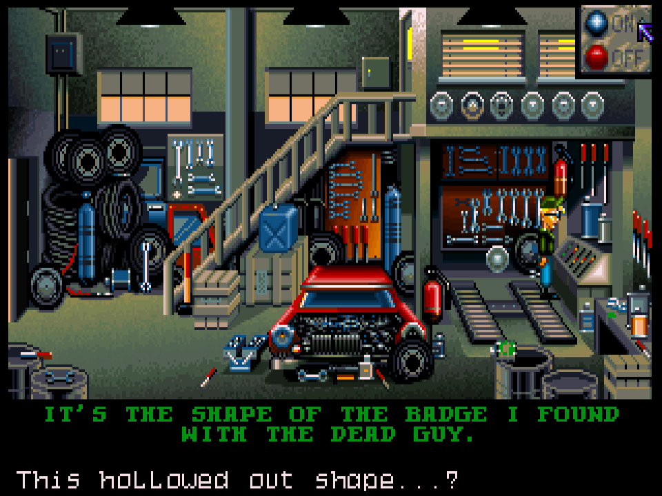 Once you get past the copy protection you get into the main game, which is a fairly generic point and click adventure. Moving the cursor around the screen will call out areas you can interact with, and click on those will execute the associated action.