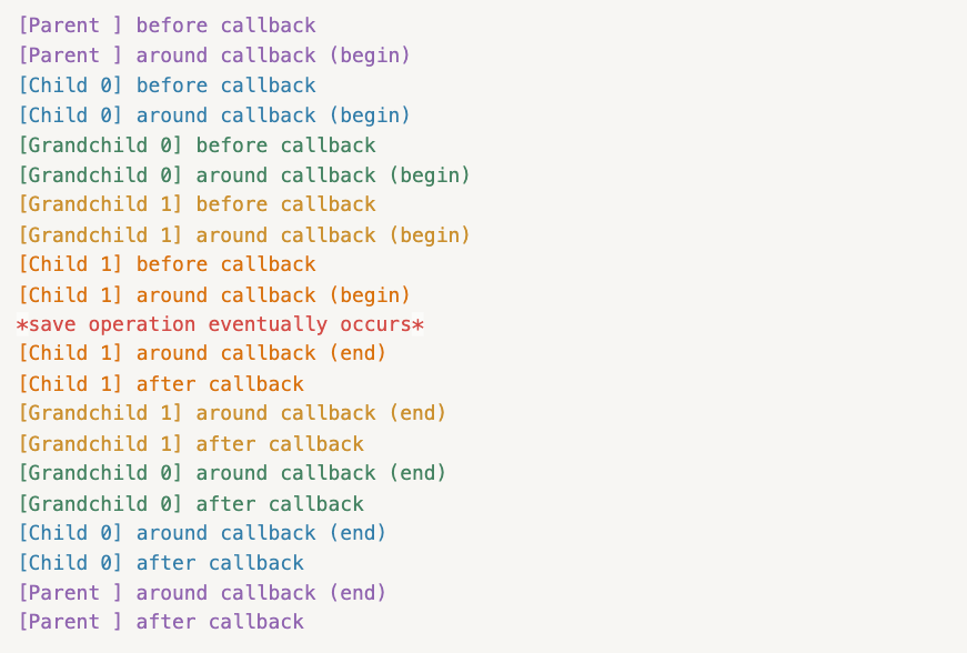 This seems intuitive as well based on colorized output (see above), where each color corresponds to one invocation of _mongoid_run_child_callbacks_with_around.