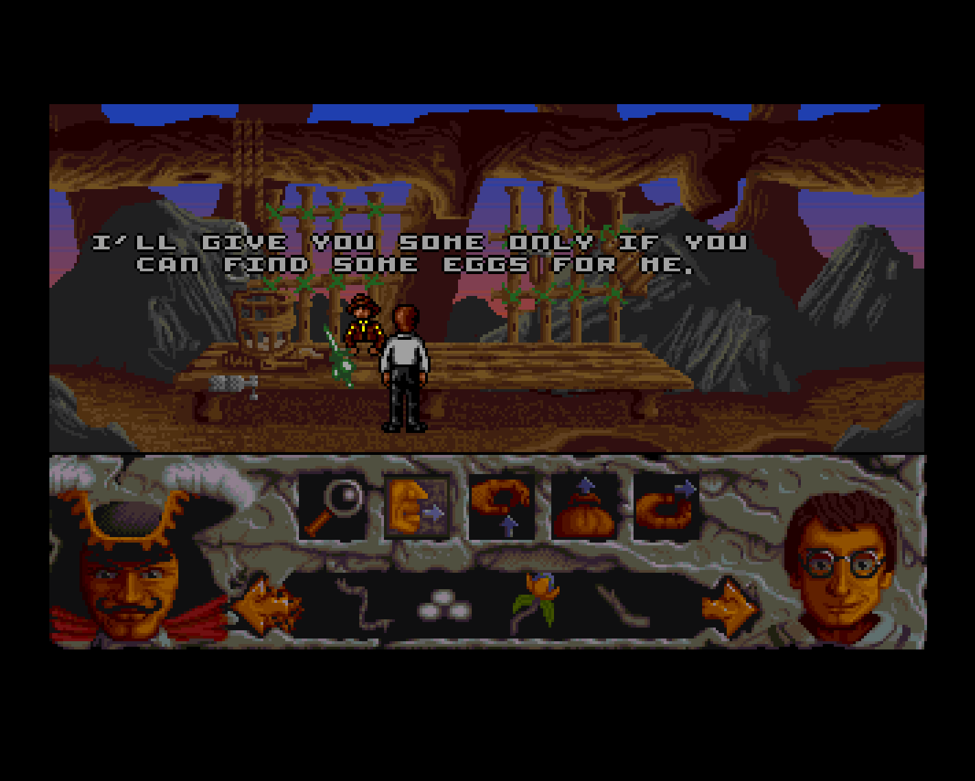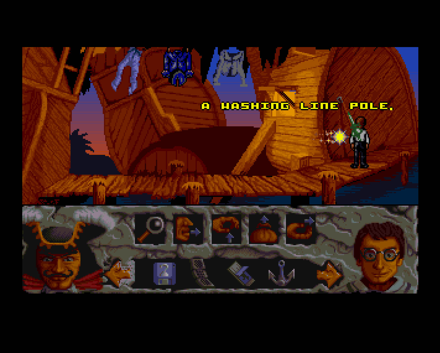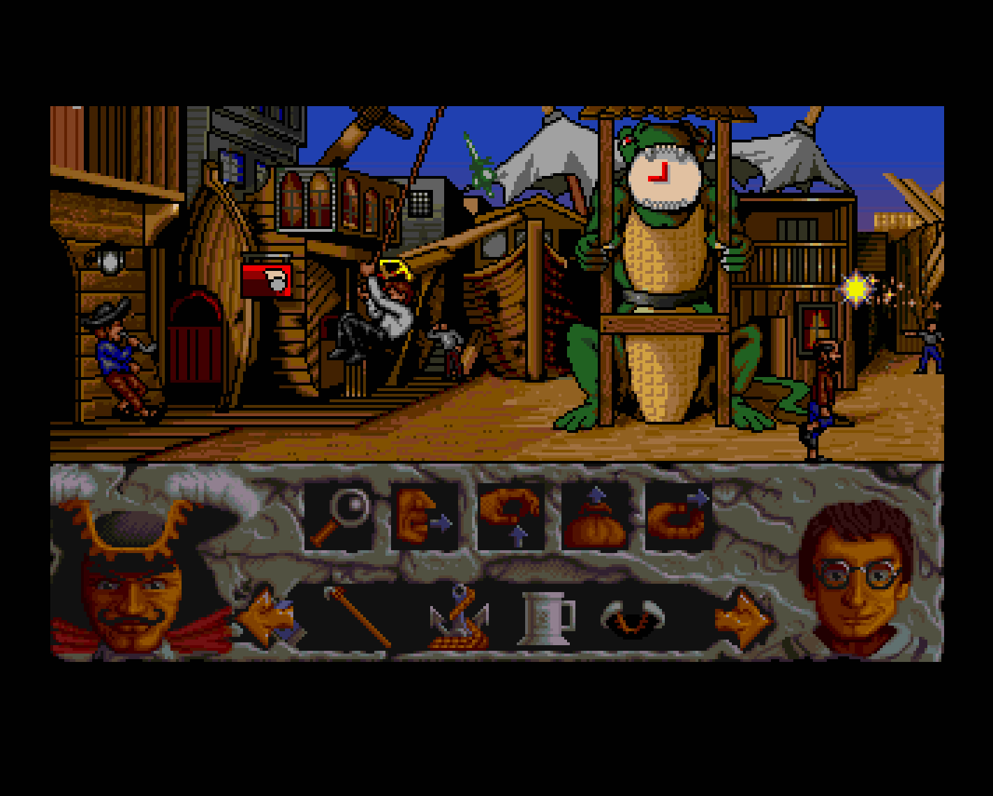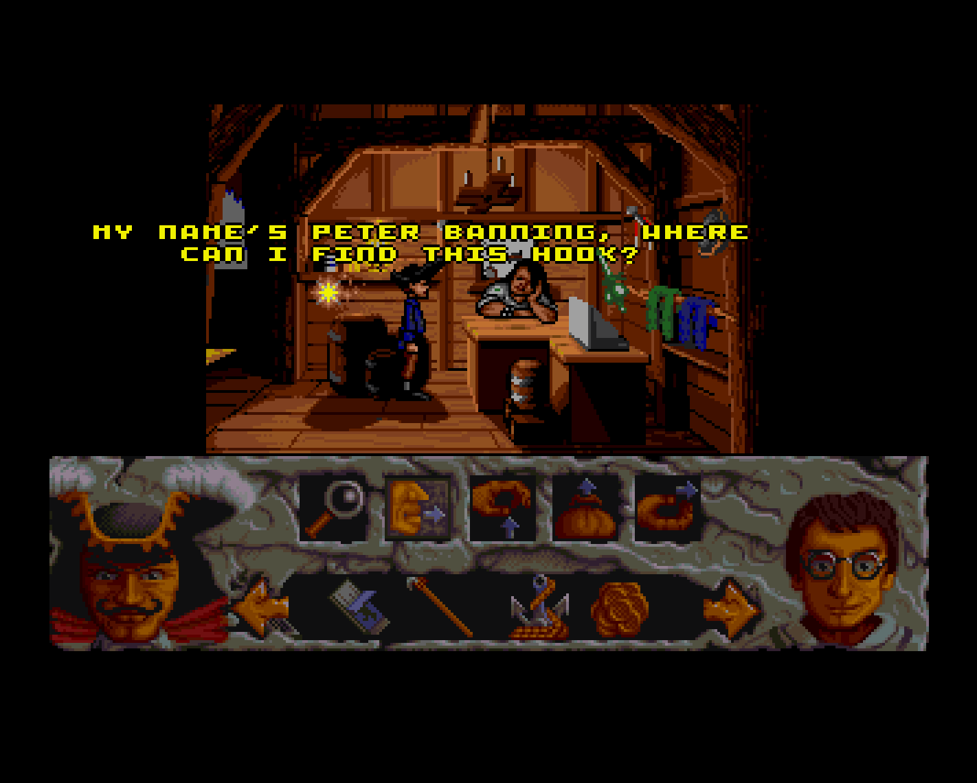 It’s a point and click adventure, and the pirate setting ensures that it recalls the Monkey Island games. The top 2/3 of the screen features a visual depiction of the area Peter is in, which a row of icons along the bottom can be selected to alter the function of a mouse click. These include looking at an object, picking it up, talking to people, using objects to solve problems (often in combination with others), and giving objects to others.1