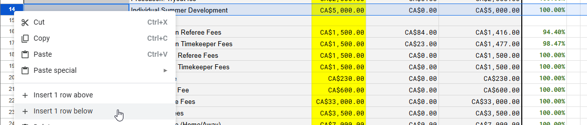I like to have all my teams’ finances in one place, so I’ll copy/paste transaction records from the online banking portal to the Bank Balance sheet.