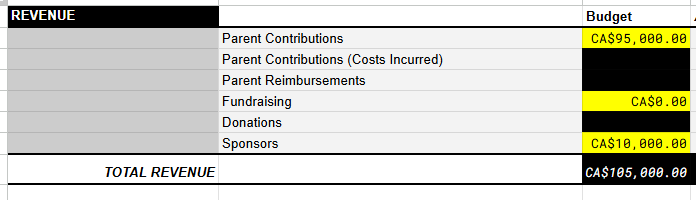 From the example above I expect to collect $95,000.00 from the parents directly, with another $10,000.00 from sponsorship and donations, for a total budget of $105,000.000.