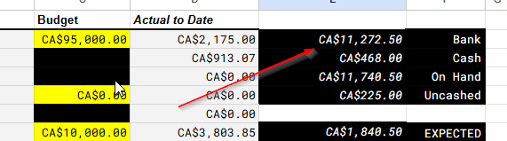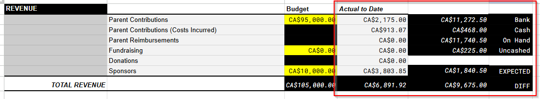 The actual amount of money we’ve collected and spent will be summarized automatically based on how we record revenue and expenses on the Transactions sheet. We will also include details for other sources of income that may be harder to track, such as: