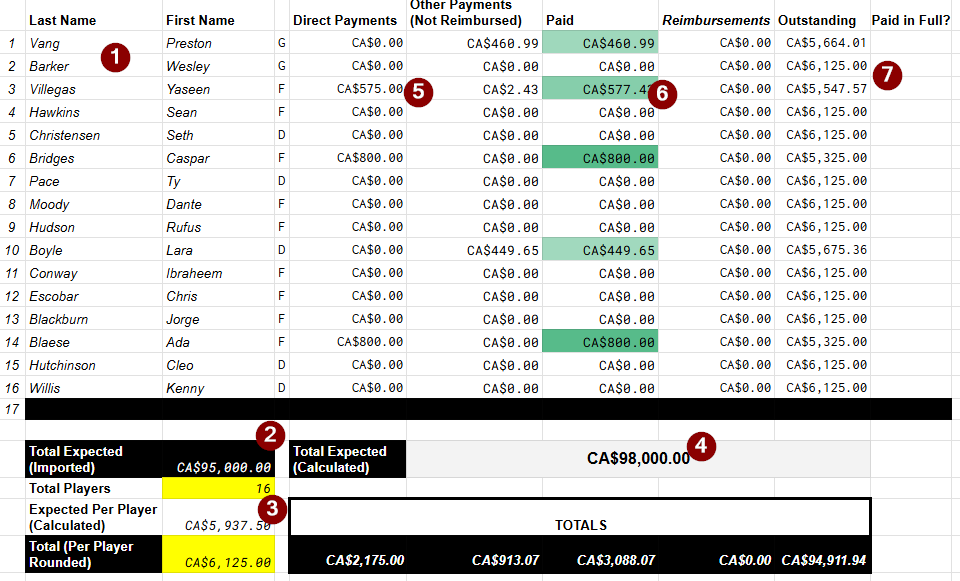 Fill out the team roster first. Only the Last Name is actually used elsewhere, and the values for Direct Payments, Other Payments (Not Reimbursed), Paid, and Reimbursements will be calculated for you based on what is recorded in the Transactions sheet.