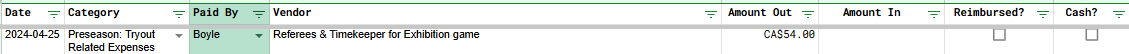 Here we can a Preseason: Tryout Related Expenses was recorded for $54.00 by a member of the Boyle family. The Paid By dropdown is populated by the Last Name of each player on the Roster sheet.