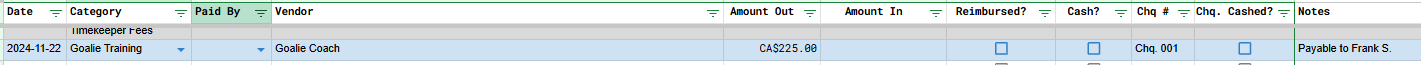 Most teams don’t have access to E-Transfer out of a community (or team) account, and will need to pay for things with cheques. In this case, you just enter the cheque number in the Chq column - and once the cheque has been cashed, click off the Chq. Cashed? checkbox.
