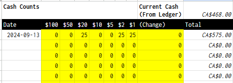 Periodically I’ll do a count, which I record as a line item broken down by each individual denomination I have in the float. If my Total matches the Current Cash - everything’s accounted for!