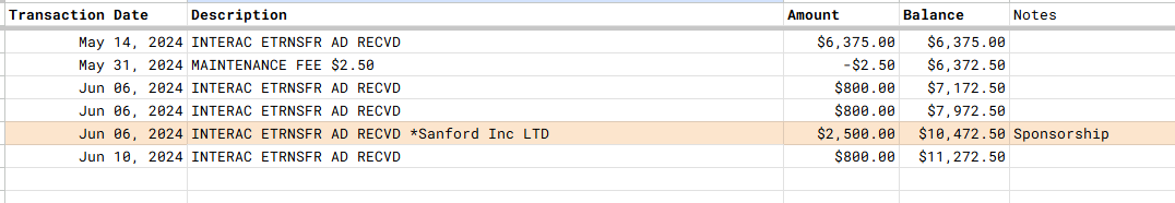 | June 10 | CA$800.00 |