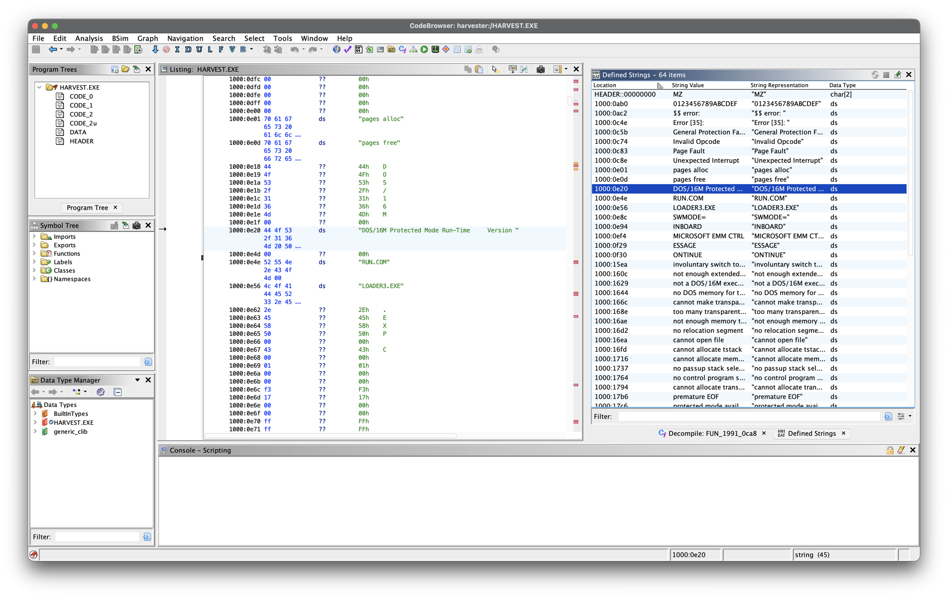 When running this against HARVEST.EXE it will produce a HARVEST.LE, which is the linear executable. Once we have this the next logical step would be to try and load it in Ghidra, but doing this doesn’t quite work as Ghidra thinks the LE file is raw data.